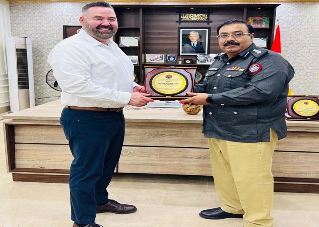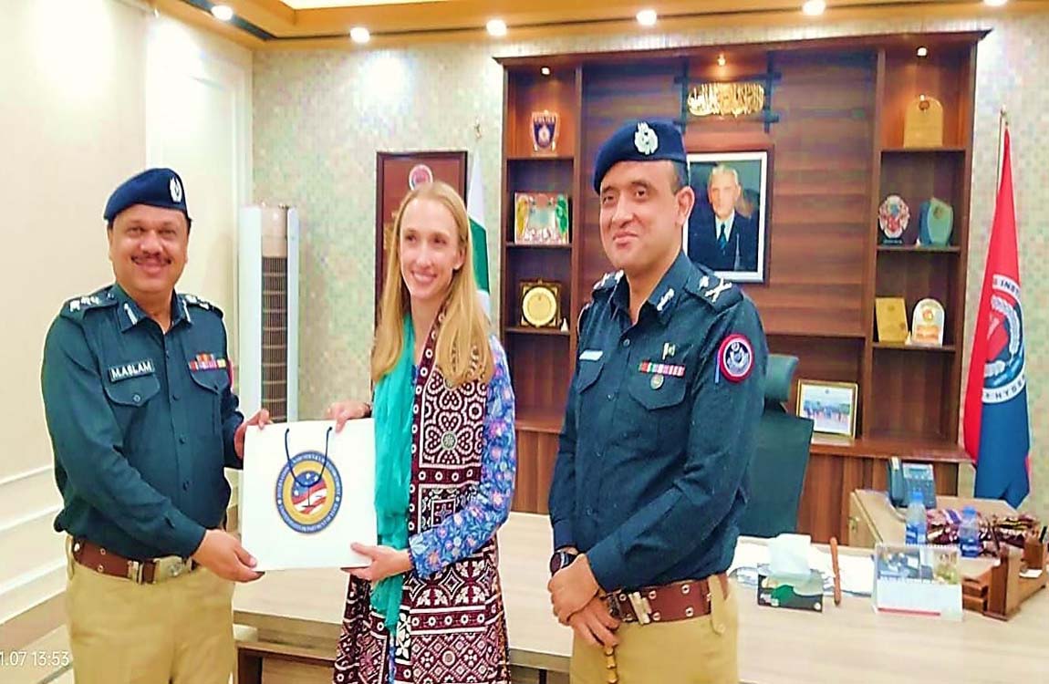 On the eve of passing out ceremony of 17th Basic Training Course for Prison Constable, Ms. Shannon Brink, GCR Officer from International Narcotics & Law Enforcement, Pakistan (INL/P) presenting a gift to Mr. Mohammad Aslam Malik, SSP / Principal Sindh Prisons Staff Training Institute Hyderabad on 07-11-2023 in presence of Syed Munawwar Ali Shah, Worthy Inspector General of Sindh Prisons & CS.